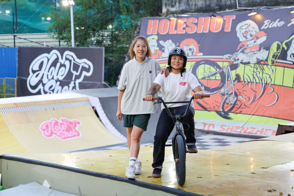 ↑2025年10月31日,黃蘊瑤(左)和她的合作夥伴王思楊子在位於深圳福田區的HOLE SHOT騎行公園內合影。新華社記者 梁旭 攝