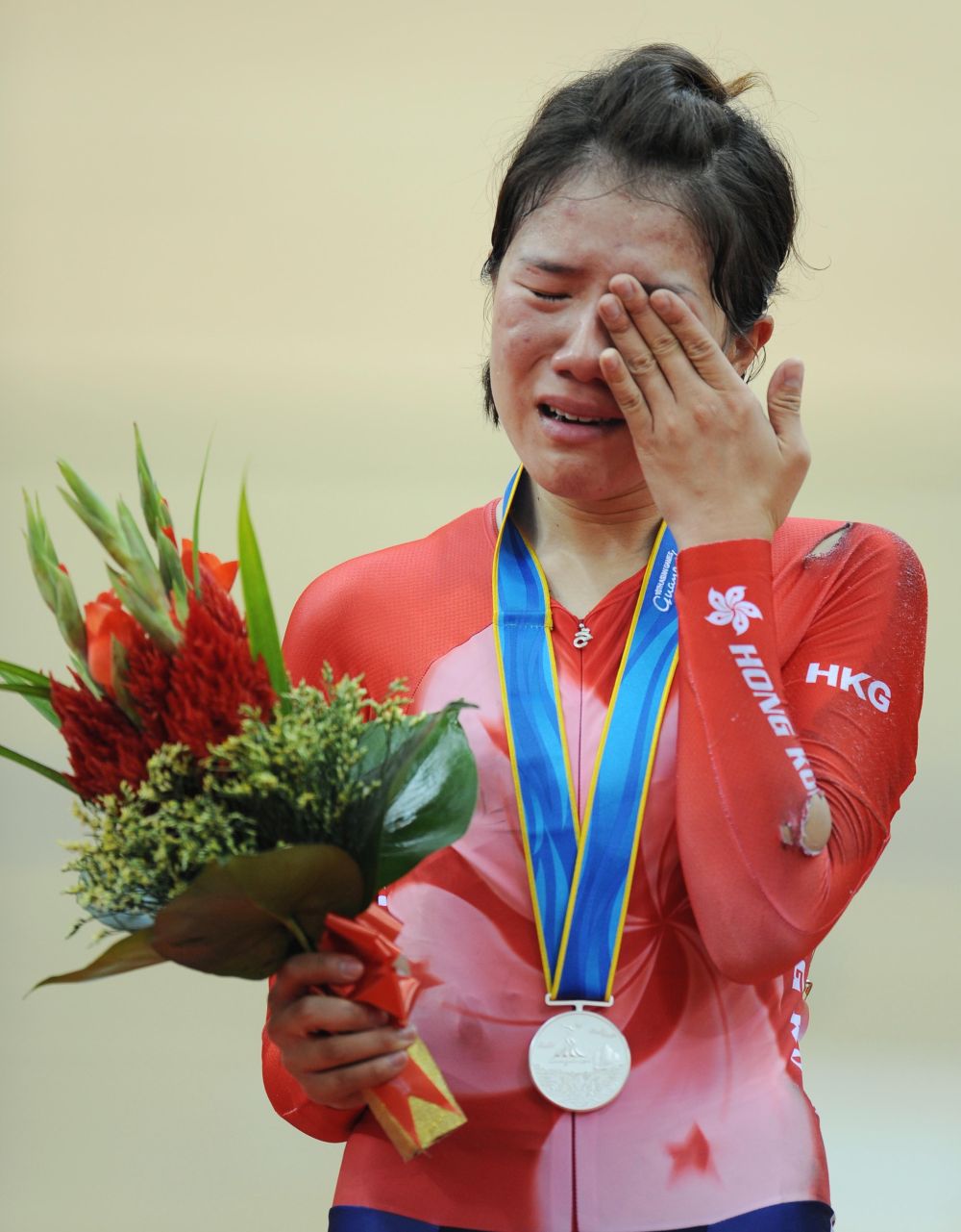 ↑2010年11月16日,中國香港選手黃蘊瑤在領獎台上流淚。當日,第16屆亞運會場地自行車女子記分賽在廣州自行車輪滑極限運動中心進行,中國香港選手黃蘊瑤以27分的成績獲得亞軍。新華社記者 李尕 攝