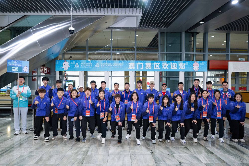 ↑2025年11月4日,福建隊在澳門國際機場合影。當日,參加第十五屆全國運動會乒乓球項目的各代表隊陸續抵達澳門。新華社發(張金加攝)