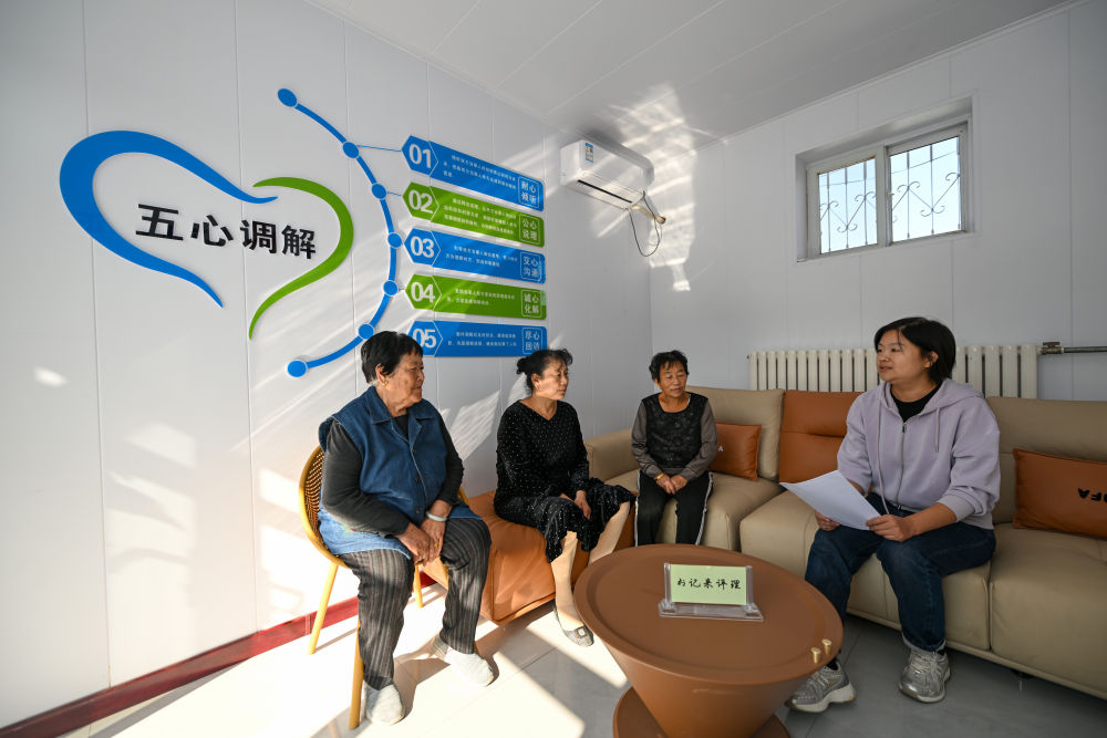 在天津市寧河區蘆台街道金華路社區,社區黨總支副書記吳蕊(右一)就社區監控設備安裝問題為社區居民進行解答(2024年10月11日攝)。金華路社區積極踐行新時代「楓橋經驗」,將原社區居委會閒置用地提升改造成為聯絡群眾的基層綜合治理陣地——「解鈴小院」。新華社記者 孫凡越 攝