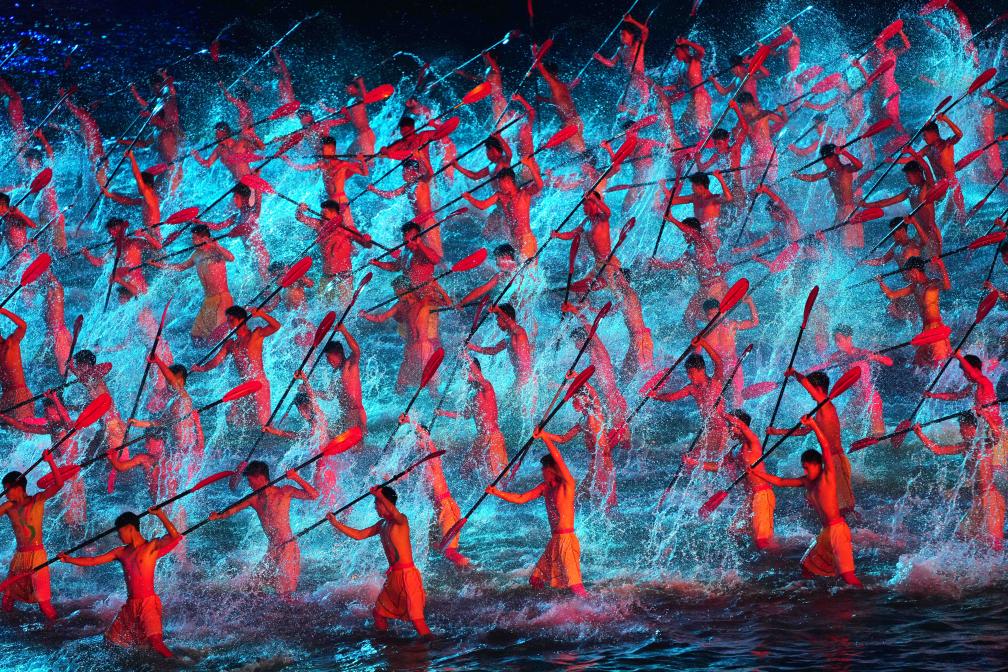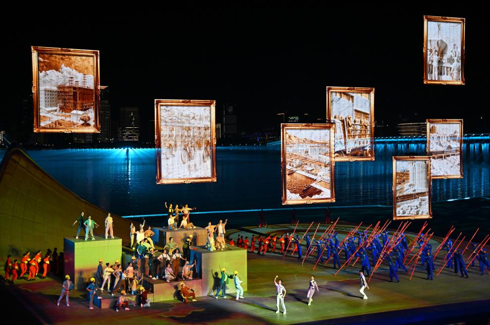 ↑11月9日,在第十五屆全國運動會開幕式上,巨型鰲魚「游入」體育場上空。新華社記者 盧漢欣 攝