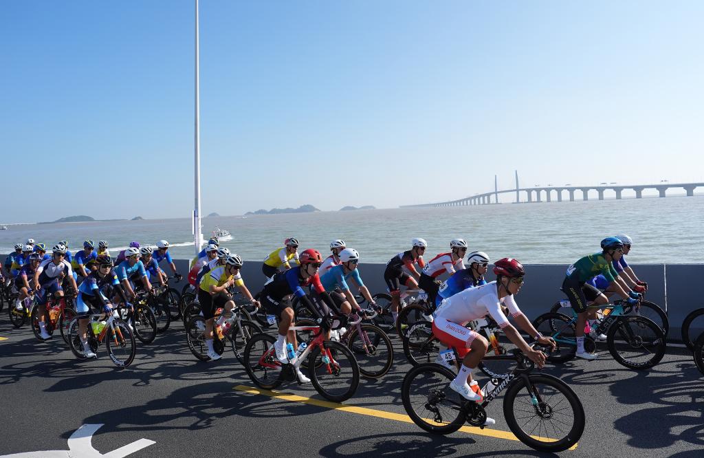 ↑11月8日,第十五屆全國運動會公路自行車男子個人賽決賽開賽,全程231.8公里,選手將經過港珠澳大橋,跨越粵港澳三地。新華社記者 顏麟蘊 攝