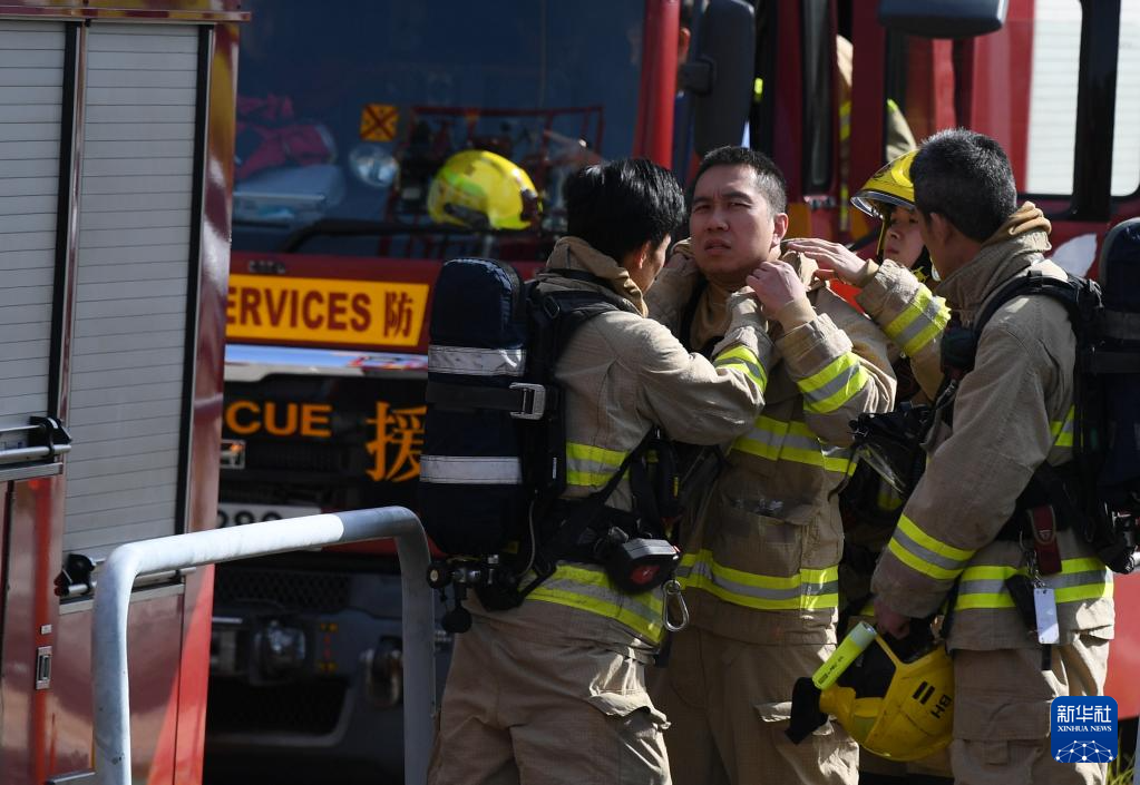 11月28日,在香港大埔區宏福苑火災救援現場,消防員互相整理防護裝備。新華社記者 陳鐸 攝