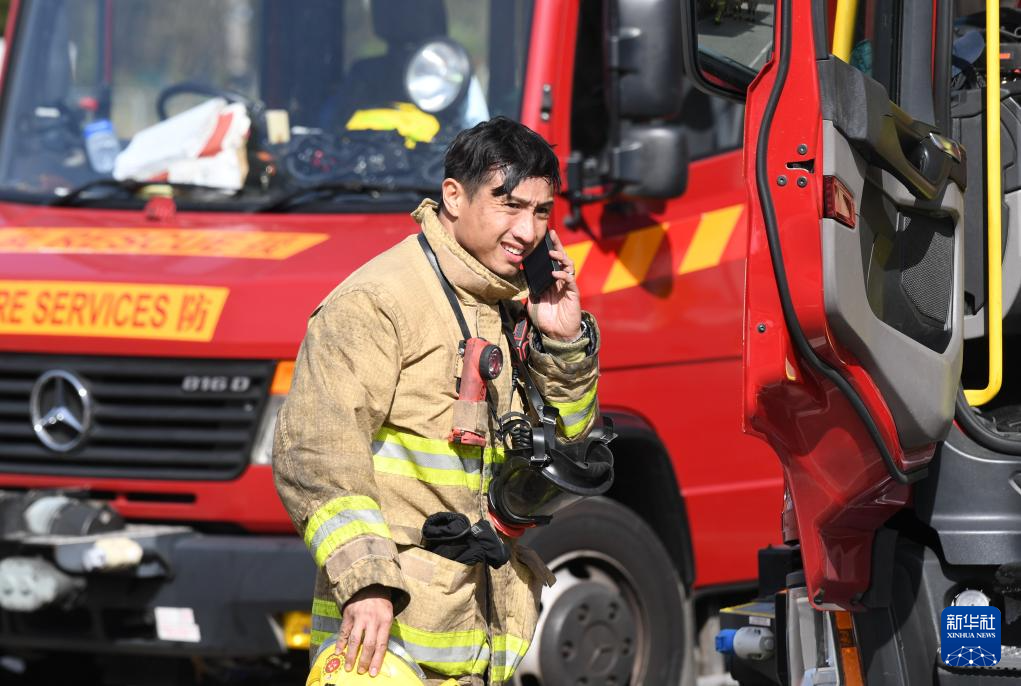 11月28日,在香港大埔區宏福苑火災救援現場,一名消防員在打電話。新華社記者 陳鐸 攝
