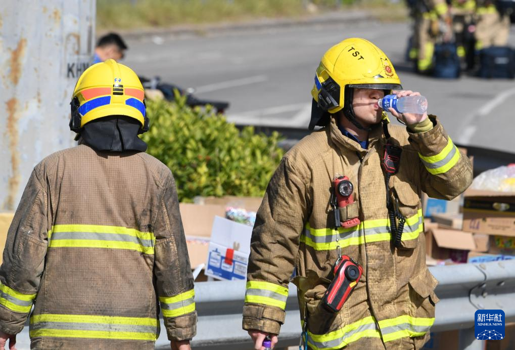 11月28日,在香港大埔區宏福苑火災救援現場,消防員休息飲水。新華社記者 陳鐸 攝