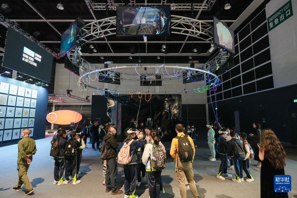 12月19日,學生在首屆香港國際AI藝術節上參觀體驗。新華社記者 朱煒 攝