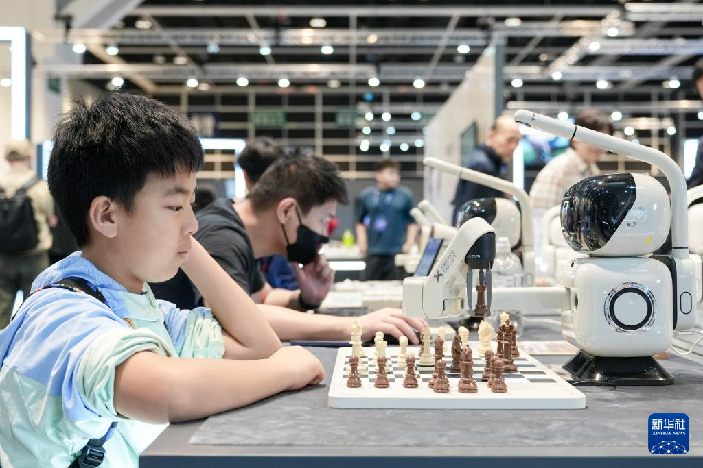 12月19日,一名兒童在首屆香港國際AI藝術節上與機器人對弈。新華社記者 朱煒 攝