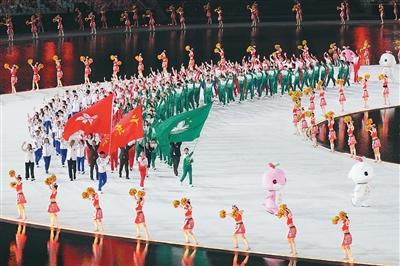 11月9日,第十五屆全國運動會開幕式在廣東奧林匹克體育中心舉行。圖為廣東省體育代表團、香港特別行政區體育代表團和澳門特別行政區體育代表團在入場儀式上共同入場。(新華社記者 薛宇舸攝)