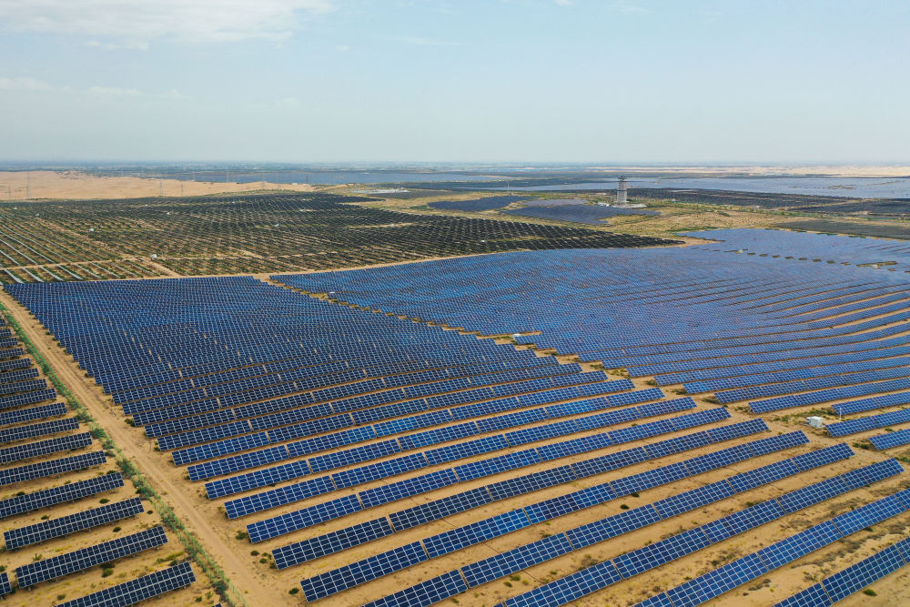 這是2025年9月10日在內蒙古庫布其沙漠拍攝的達拉特旗光伏基地。該基地將治沙與新能源産業相融合,在庫布其沙漠腹地實現了「板上發電、板下種植、板間養殖」的立體生態循環模式。2025年,一塊塊藍色光伏板在北疆構築起一道一望無際的「光伏長城」,成為生態治理、經濟發展的堅實屏障。