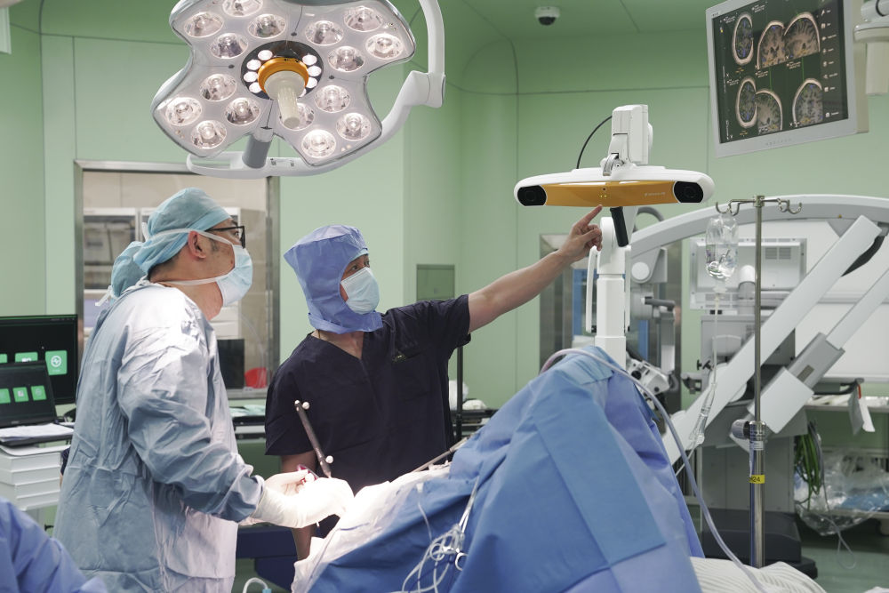 2025年3月25日,路俊鋒教授(左)和吳勁松教授在復旦大學附屬華山醫院手術室給第一例臨床試驗受試者做手術。2025年3月,中國科學院腦科學與智能技術卓越創新中心聯合復旦大學附屬華山醫院與相關企業,開展侵入式腦機接口的前瞻性臨床試驗。這標誌我國在侵入式腦機接口技術上,成為全球第二個進入臨床試驗階段的國家。