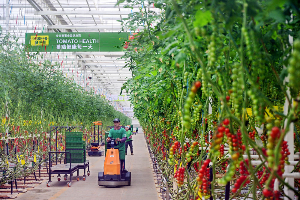 2025年3月4日,員工在山東省萊西市望城街道凱盛浩豐現代設施農業産業園智慧玻璃溫室內忙碌。該溫室採用國産超白減反無影玻璃,透光率高,可保證射入的自然光線得到充分利用。我國正加快發展農業新質生産力,以科技賦能糧食生産、儲存、加工全鏈條,推動「汗水農業」向「智慧農業」加速邁進。