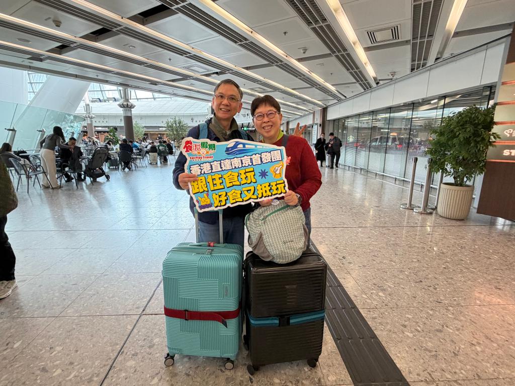 1月26日,在港鐵公司聯合旅行社組織的新線路首發團活動上,即將前往南京的香港市民在出發前合影。新華社發(郭辛 攝)