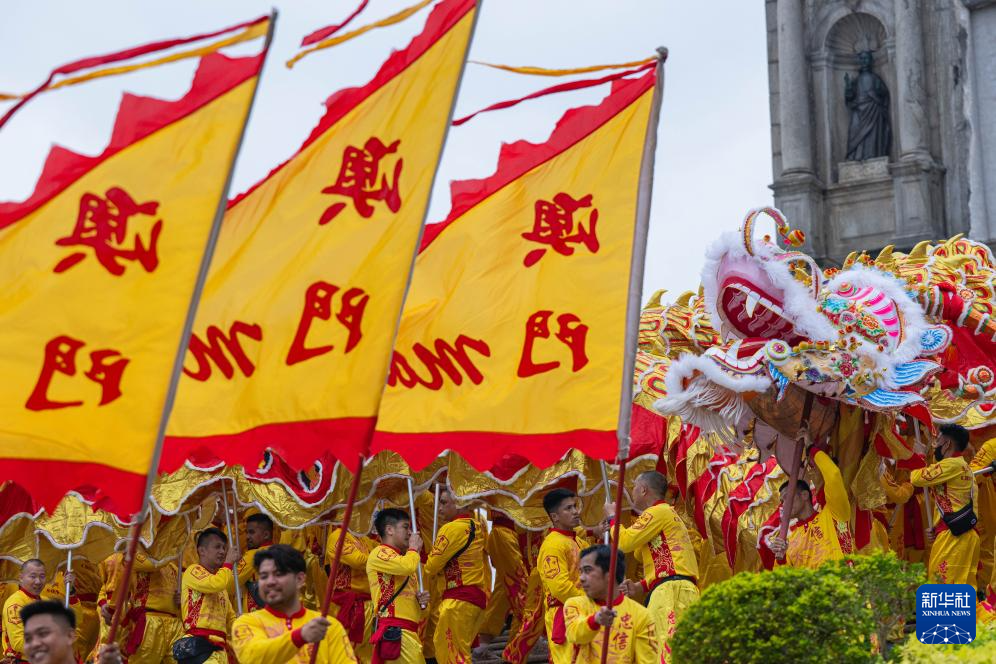 2月17日,舞龍隊伍在澳門大三巴牌坊前表演。 新華社發(張金加攝)