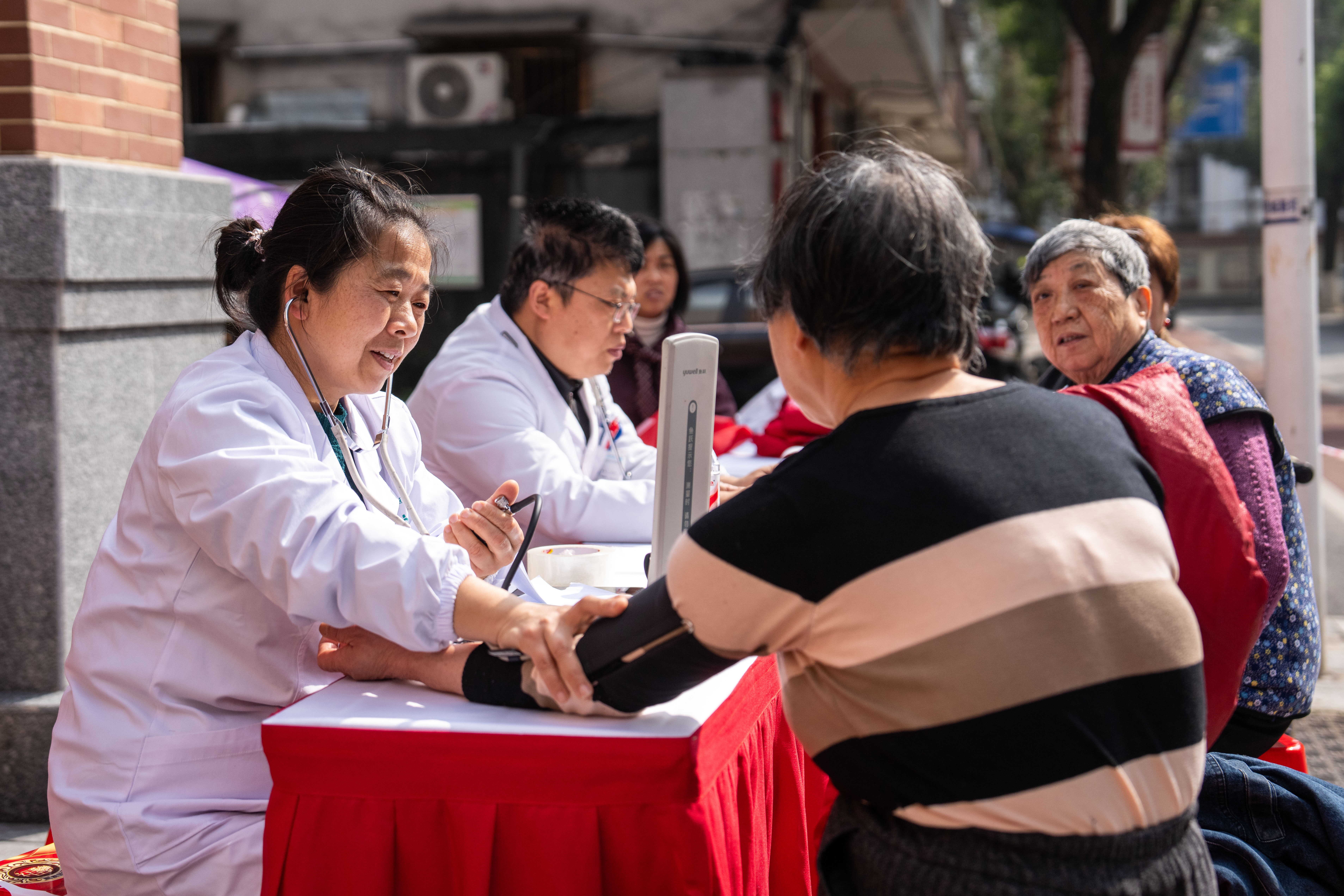 2026年3月5日,在湖南長沙市望城區高塘嶺街道雷鋒路社區雷鋒驛站,志願者(左一)為市民測量血壓。新華社記者 陳思汗 攝