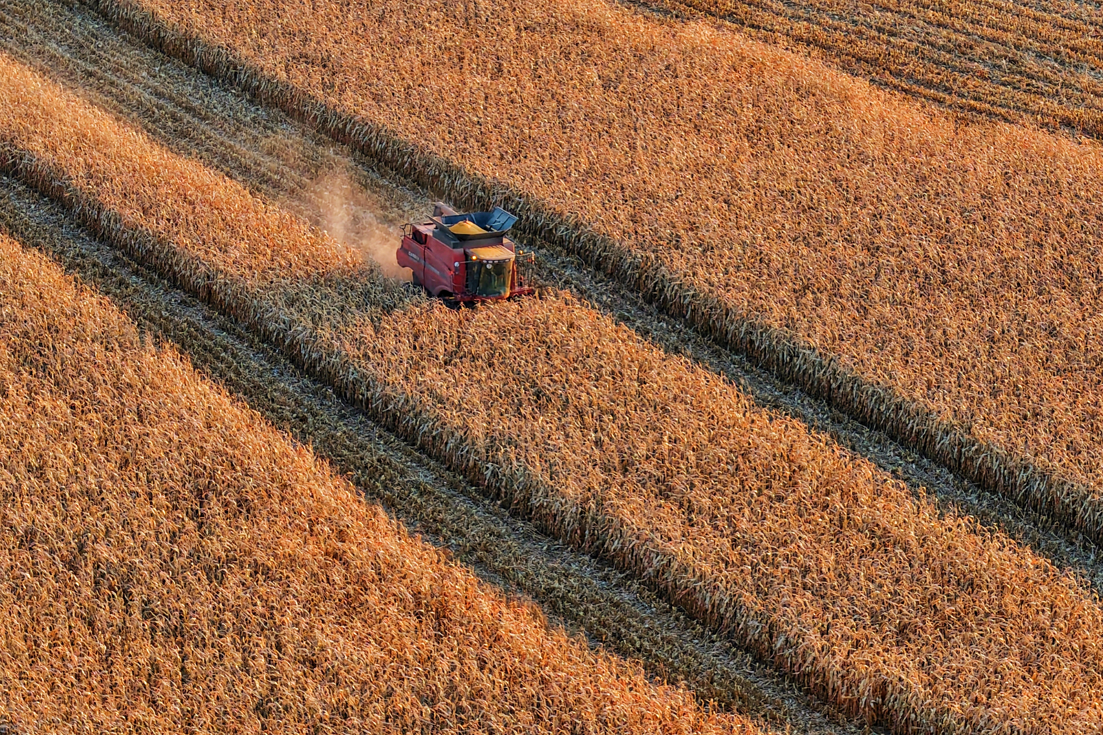 2025年10月14日,在黑龍江同江市街津口赫哲族鄉,農戶在收穫玉米(無人機照片)。新華社發(劉萬平攝)