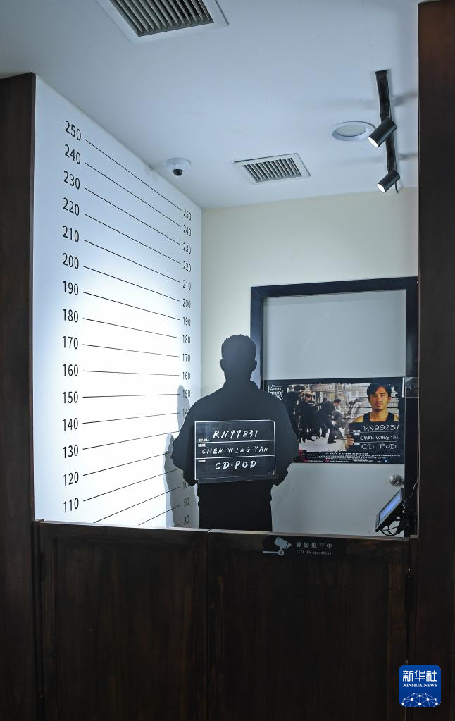 在羈留室區域,粗糙的水泥墻上挂着《英雄本色》等經典電影的海報;相鄰房間則陳列着各式囚服與舊式梳粧用具,與一旁被巧妙改造為復古照相亭的囚室並置。參觀者可以在此選擇扮演警察或疑犯拍照,也可以通過AI技術將自己的臉合成到《無間道》等電影海報上,過一把「主角癮」。