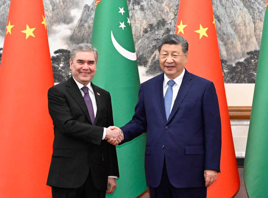 3月18日下午,國家主席習近平在北京釣魚台國賓館會見來華進行友好訪問的土庫曼斯坦民族領袖、人民委員會主席別爾德穆哈梅多夫。