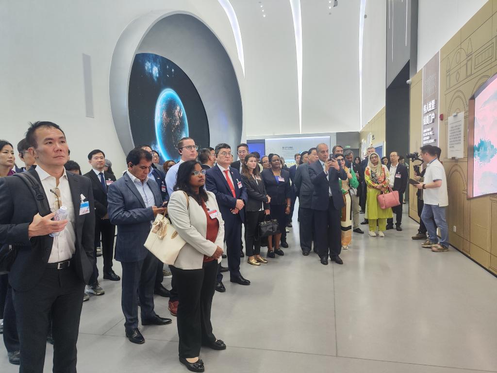 外國在港領團和商界參訪團在廣東省中山市翠亨新區規劃館參觀(4月9日攝)。新華社發(王昕怡攝)