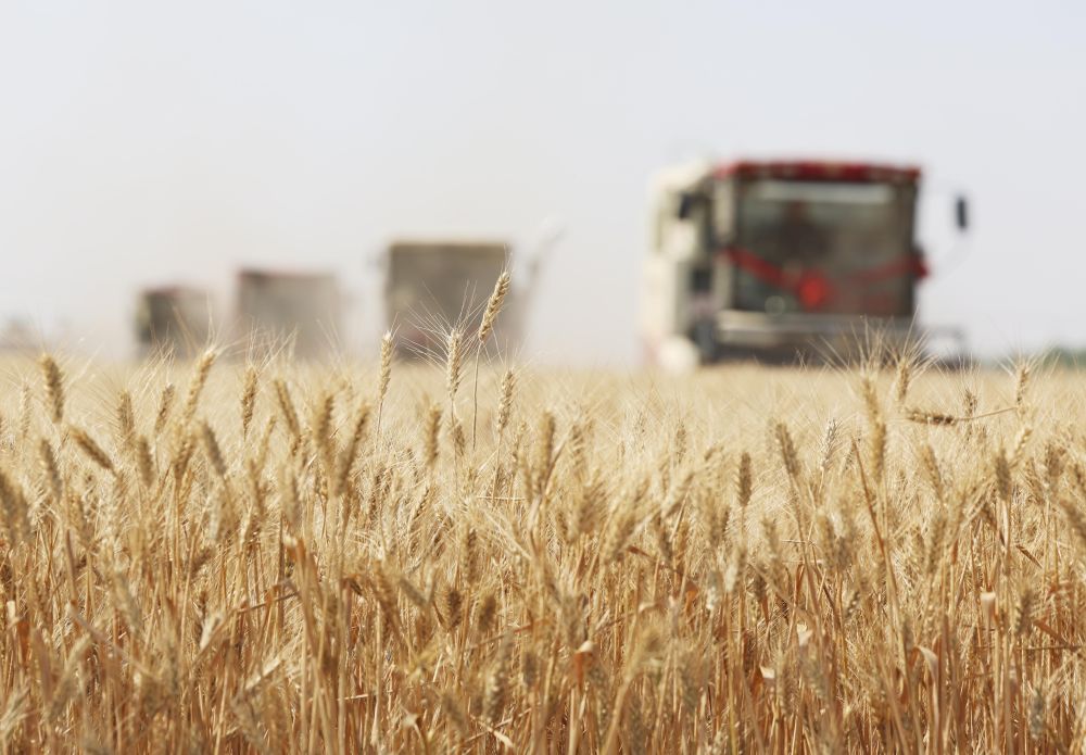 2025年6月10日,河北省石家莊市欒城區柳林屯鄉東牛村村民駕駛農機收割小麥。新華社發(梁子棟 攝)