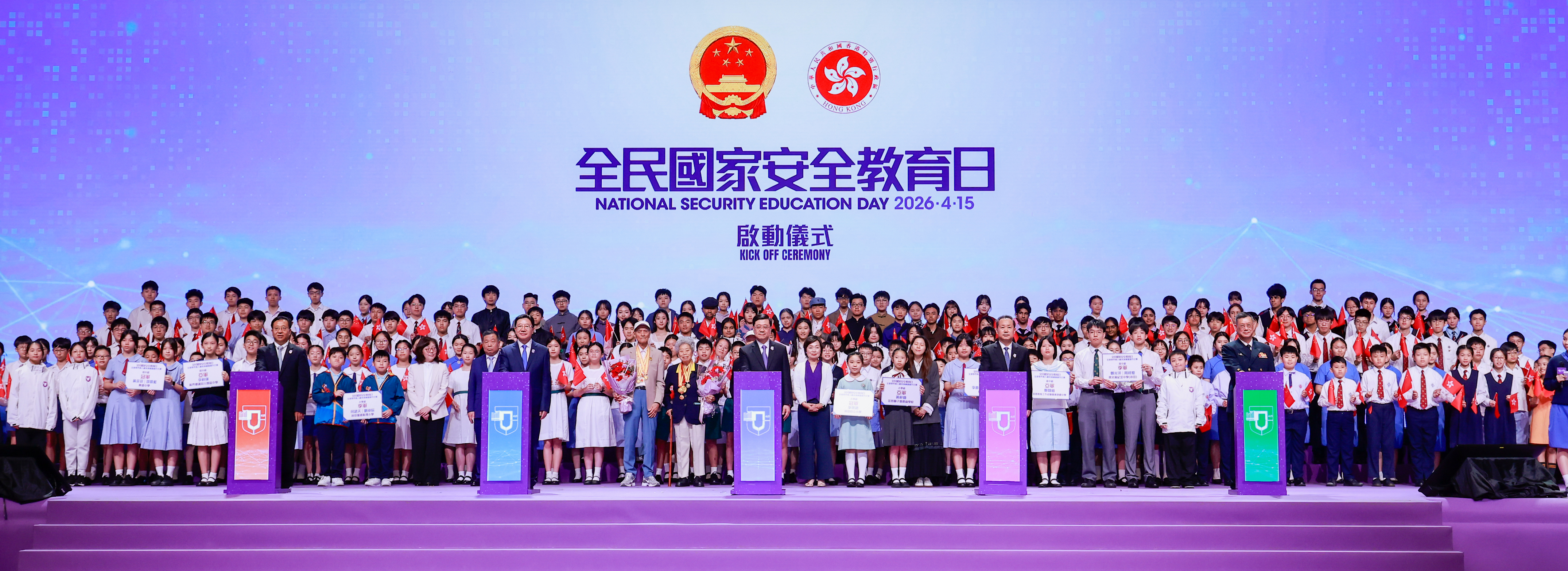 本網訊 4月15日,香港特區2026年「全民國家安全教育日」活動開幕典禮在香港會展中心舉行。中央港澳工作辦公室主任、國務院港澳事務辦公室主任夏寶龍在開幕典禮上以視頻方式發表致辭。香港特別行政區行政長官、國安委主席李家超,中央政府駐港聯絡辦主任、特區國安事務顧問周霽,中央政府駐港國家安全公署署長董經緯,外交部駐港特派員公署特派員崔建春,中國人民解放軍駐香港部隊政委賴如鑫等擔任主禮嘉賓並致辭。