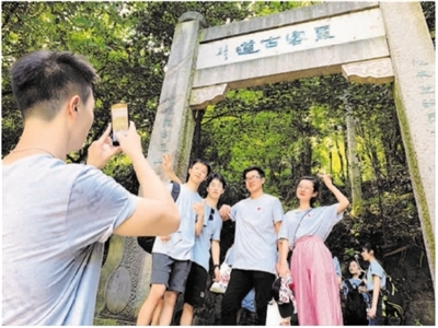 參加研學的港澳台學子走在當年徐霞客游金華山的古道上。(吳俊鵬 攝)