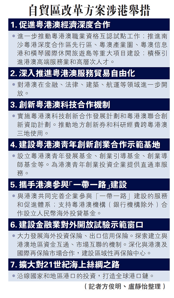 在創新粵港澳深度合作方面,深改方案對港澳專業人士執業作出了特殊制度安排,如「研究推進在自貿試驗區工作的港澳金融專業人士通過培訓測試的方式申請獲得內地從業資格,其在港澳的從業經歷可視同內地從業經歷」等,突破了粵港澳因三地專業服務因管理規則不同造成的體制機制障礙。