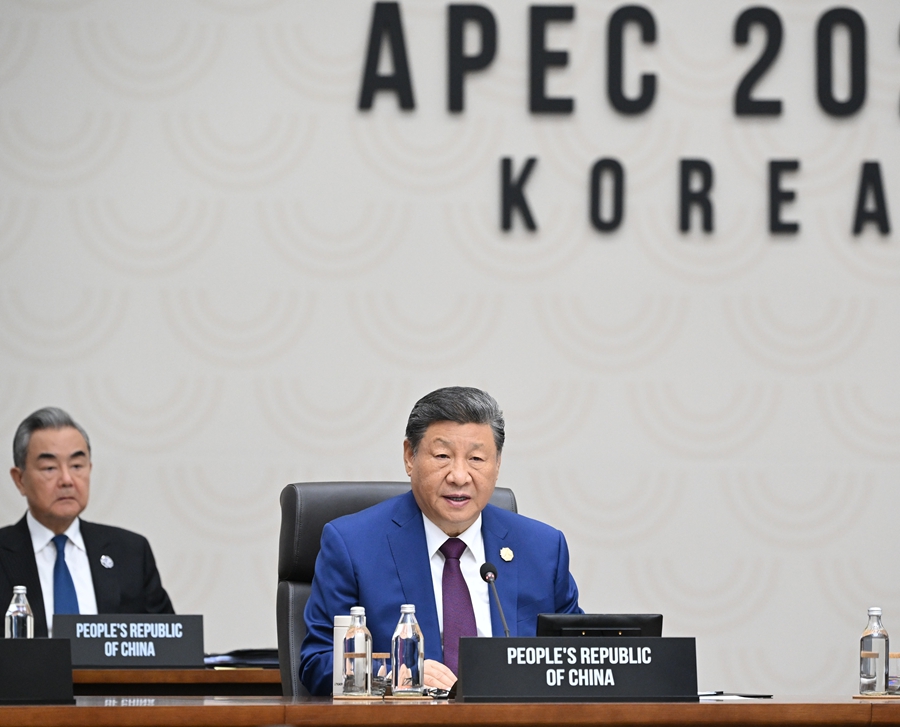 當地時間11月1日上午,國家主席習近平在韓國慶州出席亞太經合組織第三十二次領導人非正式會議第二階段會議,並發表題為《共同開創可持續的美好明天》的重要講話。新華社記者 謝環馳 攝
