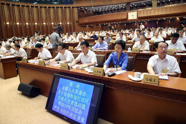 張德江説,本次會議的一項重要內容,是審議通過了關於香港特別行政區行政長官普選問題和2016年立法會産生辦法的決定。這是全國人大常委會依法對香港特別行政區政制發展問題作出的又一個重要決定,對於全面貫徹落實「一國兩制」、「港人治港」、高度自治方針和香港基本法,推動香港循序漸進發展民主、依法落實2017年行政長官普選,具有重大意義。