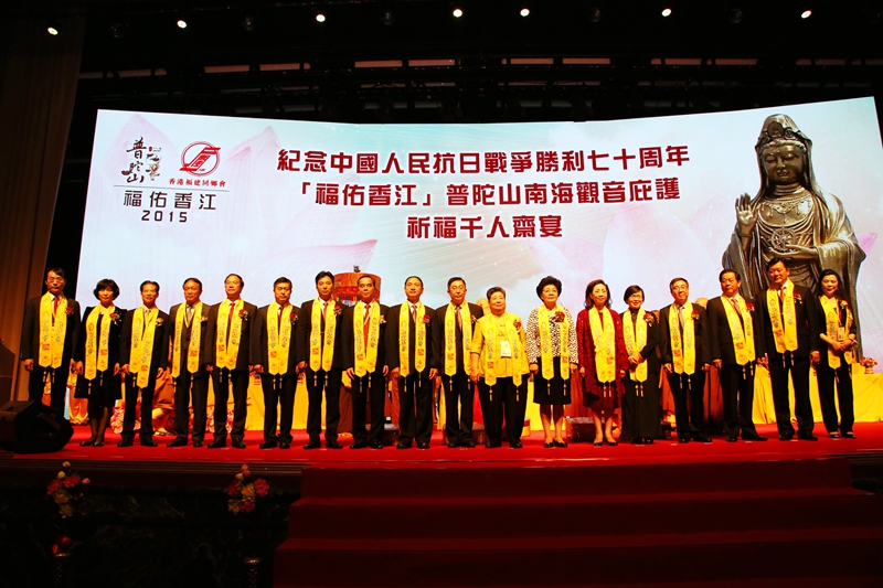 本網訊 8月22日 ,香港福建同鄉會、舟山市普陀山風景名勝區管理委員會、普陀山佛教協會在香港會展中心聯合舉辦「紀念中國人民抗日戰爭勝利70周年暨福佑香江▪普陀山南海觀音庇護祈福千人齋宴」。中央政府駐港聯絡辦副主任殷曉靜與香港特區行政長官夫人梁唐青儀、香港民政事務局副局長許曉暉、中國僑聯副主席喬衛、福建省政協副主席陳向先、香港福建同鄉會會長陳聰聰,中國佛教協會副會長、普陀山佛教協會會長道慈大和尚等出席並擔任主禮嘉賓。香港社會各界人士及內地有關部門負責人、兩地佛教信徒近2500人參加。