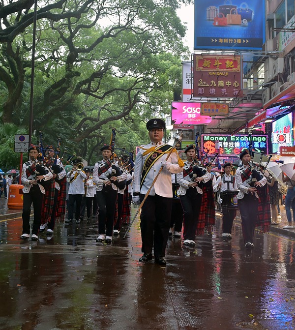 8月30日,香港巡游隊伍在途中演奏。新華社記者 何靖嘉 攝