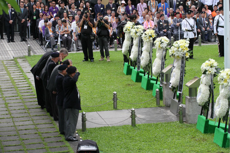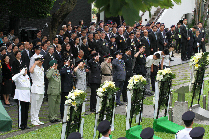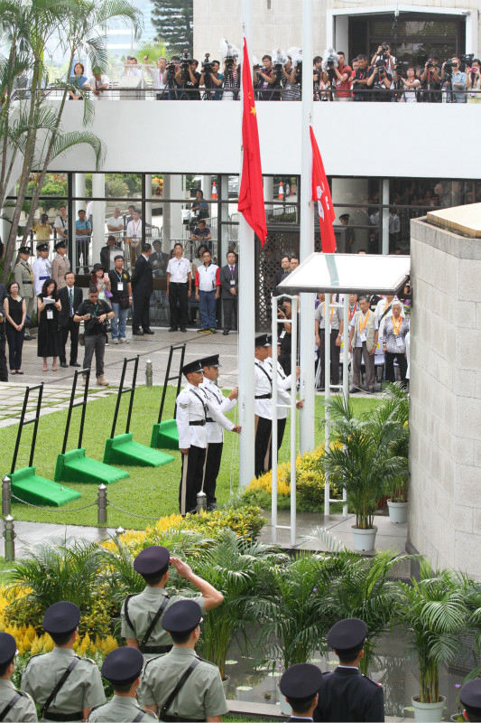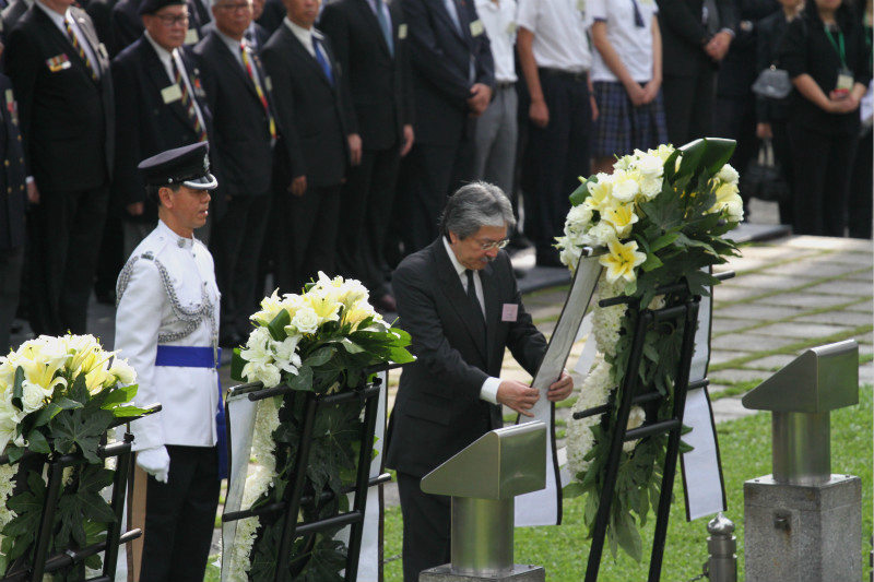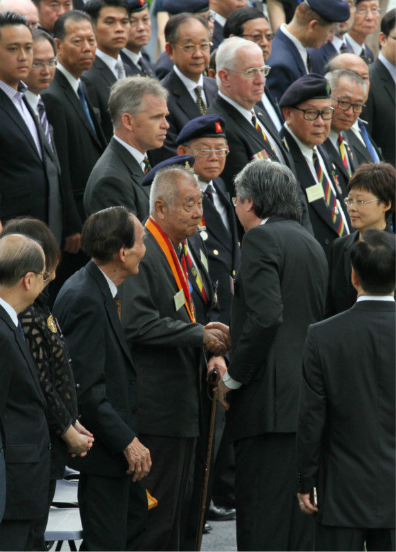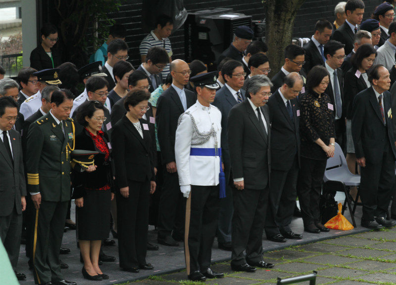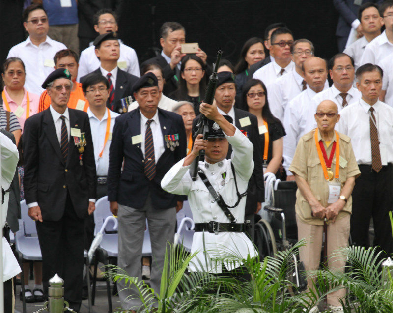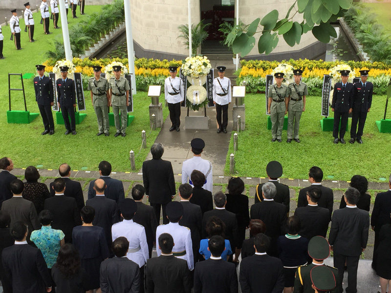 本網訊 9月3日上午8時,香港特區政府在中環大會堂紀念花園舉行中國人民抗日戰爭勝利70周年紀念儀式,署理行政長官曾俊華、中央政府駐港聯絡辦副主任仇鴻、外交部駐港特派員公署副特派員佟曉玲、解放軍駐港部隊副司令員李維亞及香港抗戰老戰士代表等社會各界人士700人出席。國歌聲中,國旗、區旗冉冉升起,警察步槍儀仗隊鳴槍、全體嘉賓默哀,隨後紀律部隊儀仗隊向抗戰紀念龕獻花,署理行政長官及各界代表分別上前行禮,向先烈致敬。
