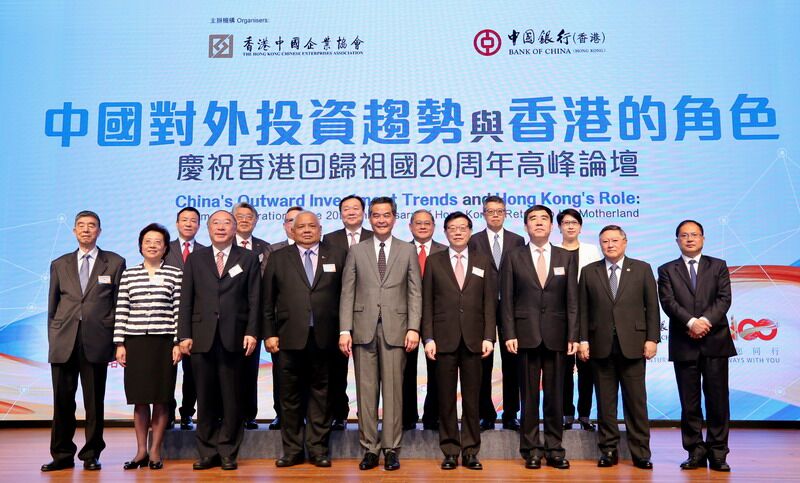 本網訊 6月14日,香港中國企業協會與中國銀行(香港)有限公司在會展中心共同舉辦「中國對外投資趨勢與香港的角色——慶祝香港回歸祖國20周年高峰論壇」。香港特別行政區政府投資推廣署、香港貿易發展局、香港中華總商會及香港總商會協辦。中央政府駐港聯絡辦副主任仇鴻應邀出席並擔任開幕式主禮嘉賓。