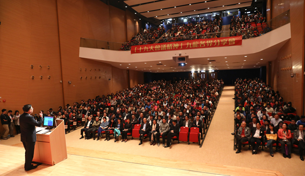 何靖在《共擔歷史責任,共享偉大榮光》的主題宣講中説,十九大報告指明了中國未來的發展方向,蘊涵巨大發展機遇和紅利,與香港息息相關,深入學習和掌握十九大精神,對香港更好地融入國家發展大局至關重要。他從「新時代」、「新目標」、「新思想」三個角度分享了對十九大報告的認識和體會,指出中國特色社會主義取得了歷史性新成就,中國進入了「強起來」的新時代,並朝着建設「富強民主文明和諧美麗的社會主義現代化強國」的新目標邁進。中國共産黨不僅「能幹事」,更能「幹成事」,其關鍵在於始終以人民為中心、找到並堅持中國特色社會主義這一適合中國發展的制度和道路,並持之以恒、持續用力地去執行長期規劃。十八大以來,以習近平總書記為主要代表的中國共産黨人,順應時代發展,從理論和實踐上系統回答了新時代堅持和發展什麼樣的中國特色社會主義、怎樣堅持和發展中國特色社會主義這個重大時代課題,創立了習近平新時代中國特色社會主義思想,要以這一「新思想」作為「新時代」實現「新目標」的行動指南。