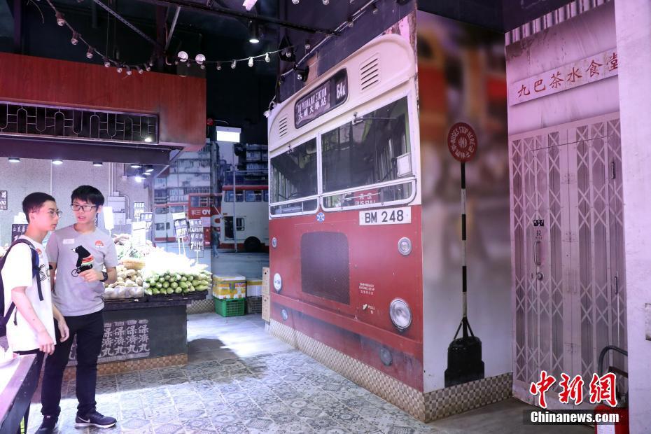 「香港街市」內裝飾成六十年代的模樣,再現九龍巴士站舊時場景。圖為4月29日,游客在「香港街市」參觀。中新社記者 洪少葵 攝