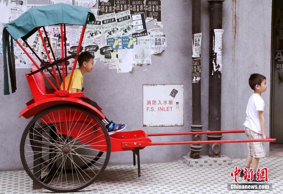 「香港街市」門外有一懷舊人力車供游客拍照用。街市內裝飾成六十年代的九龍城寨,到各式各樣的古老攤檔,都富有懷舊色彩,將老香港文化一一呈現。圖為4月29日,兩名小童興高采烈登上人力車拍照。中新社記者 洪少葵 攝