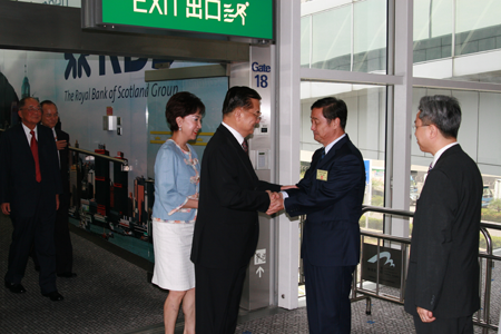 本網訊 9月4日中國國民黨榮譽主席連戰夫婦一行25人經香港轉機赴西安祭祖。此行還將到新疆了解大陸西部開發情況,並與當地台商交流。中央政府駐港聯絡辦台務部部長邢魁山、香港特區政府政制及內地事務局秘書長羅智光、中共中央台辦局長何建華專程到機場迎接連戰夫婦在港轉機。