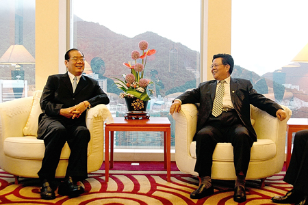 本網訊 6月18日,中央政府駐港聯絡辦副主任周俊明會見並宴請了來港訪問的中國國民黨副主席曾永權一行。曾永權今年3月20日當選台灣中華港澳之友協會會長;此次應香港智經研究中心、香港理工大學聯合邀請,於6月17日至18日對香港進行為期兩天的訪問。隨同曾永權訪港的有曾永權辦公室主任謝文煌、中華港澳之友協會秘書長張仕賢等。