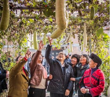 李嘉誠到西安大石頭村與女村官交流,期間一起走到瓜棚下觀賞葫蘆瓜收成情況。來源:香港《大公報》