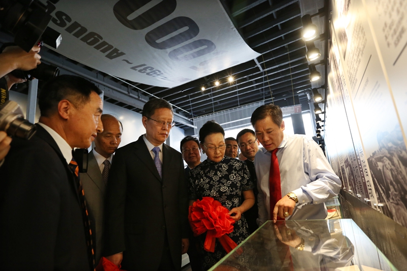 8月15日,在美國舊金山,紀念館發起人方李邦琴(前排右二)、中國國務院僑務辦公室副主任李亞非(前排右三)、中國駐舊金山總領事羅林泉(前排右四)參觀紀念館。新華社 劉藝霖攝