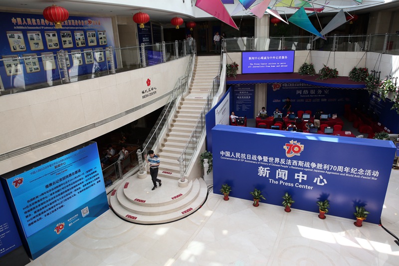 8月27日,中國人民抗日戰爭暨世界反法西斯戰爭勝利70周年紀念活動新聞中心開始對外接待服務。新聞中心設在北京梅地亞中心賓館。新聞中心將為前來採訪紀念活動的香港特別行政區、澳門特別行政區、台灣地區的記者和外國記者辦理採訪證件,受理採訪申請,安排記者採訪紀念活動,並為記者的採訪報道提供便利的信息服務和必要的技術保障。新華社記者 金立旺 攝