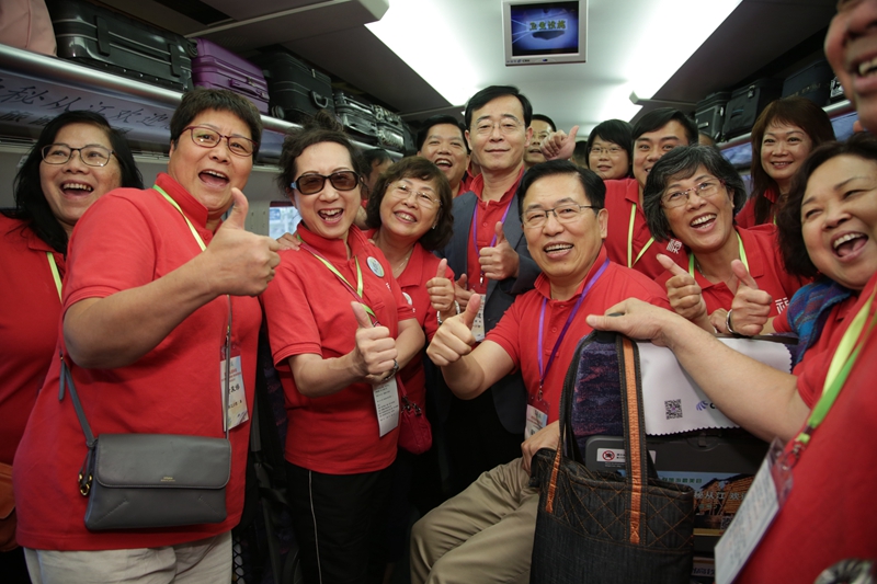 第三分團團員在返程列車上與劉林 江達可合影。(圖片來源:新界各界慶委會)