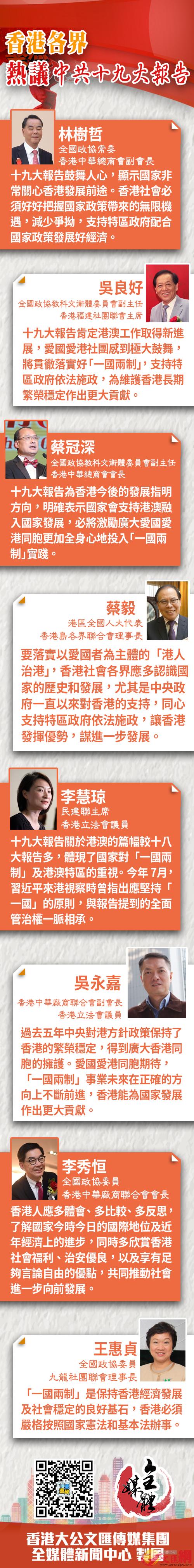 習近平18日在中共十九大報告中指出,「一國兩制」是保持香港長期繁榮穩定的最佳制度安排,必須全面準確貫徹,要完善落實香港基本法的機制,又提到要把維護中央對港澳特區全面管治權和保障特區高度自治權有機結合起來。香港社會各界人士接受採訪時表示,廣大愛國愛港同胞大受鼓舞,支持香港貫徹落實「一國兩制」、支持特區政府依法施政。