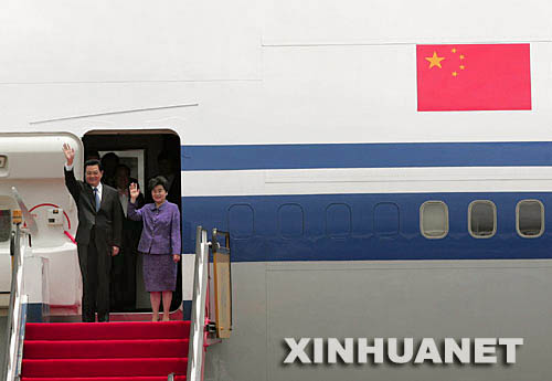 6月29日11時32分,中共中央總書記、國家主席、中央軍委主席胡錦濤乘專機抵達香港。這是胡錦濤主席和夫人向歡迎的人群揮手致意。 新華社記者周磊攝