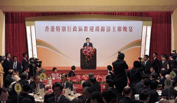 國家主席胡錦濤30日晚出席香港特別行政區政府歡迎晚宴並發表重要講話。他希望香港同胞進一步弘揚自強不息的拼搏精神、同舟共濟的團結精神、靈活應變的創新精神,把香港建設成為經濟繁榮、政制民主、社會和諧、環境優美、生活美好、同祖國內地關係更密切、同世界聯繫更廣泛的現代化國際大都市。