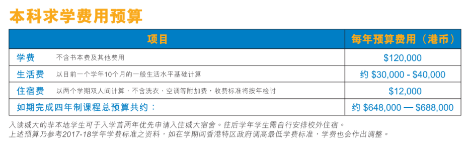 香港城市大學本科生學費預算。圖片來源於香港城市大學官網。