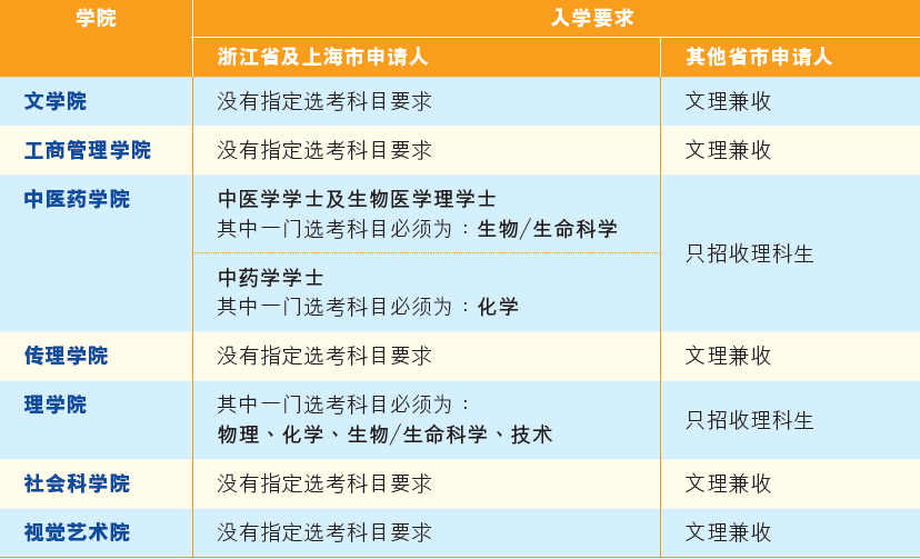 香港浸會大學各學院入學要求。圖片來源於香港浸會大學官網。