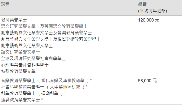 香港教育大學各專業學費。圖片來源於香港教育大學官網。