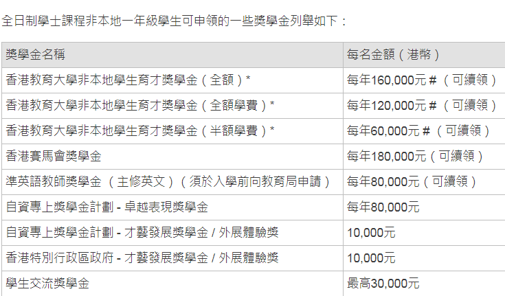 香港教育大學非本地一年級學生可申請的獎學金。圖片來源於香港教育大學官網。