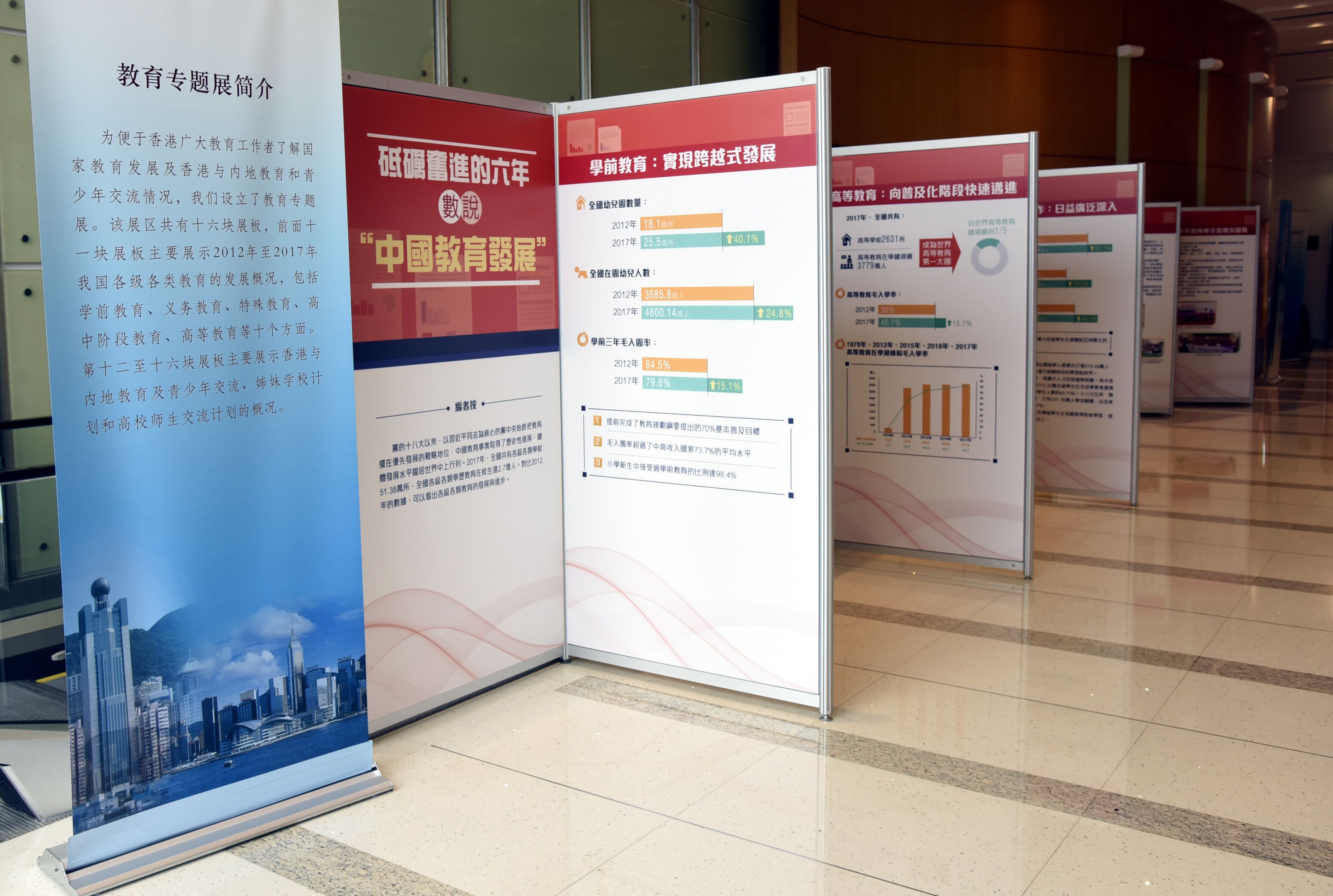 教育專題展共有16塊展板,前面11塊展板主要展示2012年至2017年我國各級各類教育的發展概況,包括學前教育、義務教育、特殊教育、高中階段教育、高等教育等10個方面。第12至16塊展板主要展示香港與內地教育及青少年交流、姊妹學校計劃和高校師生交流計劃的概況。