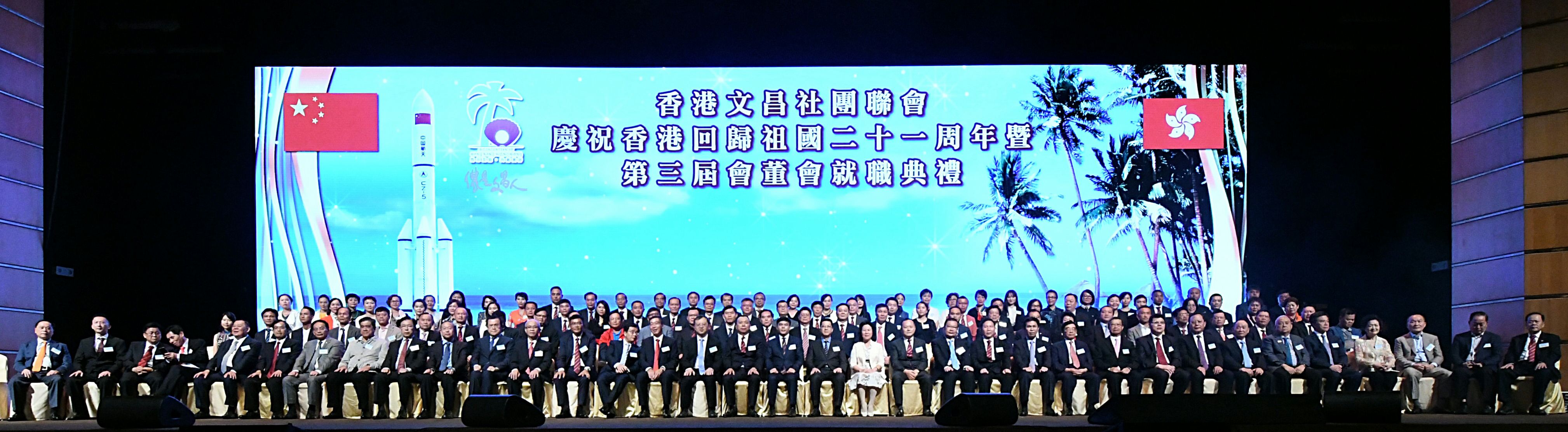 本網訊 7月2日晚,我辦秘書長文宏武出席香港文昌社團聯會慶祝香港回歸祖國21周年暨第三屆會董會就職典禮,並與全國人大常委譚耀宗,外交部駐港特派員公署副特派員趙建凱,海南省委統戰部常務副部長王琼珠,海南省外事僑務辦公室主任王勝,文昌市委書記鐘鳴明,全國政協委員張學修、黃華康,海南社團總會會長張泰超、常務副會長兼秘書長莫海濤等共同主禮。香港文昌社團聯會會長雲海清、主席符傳軍和海南省有關部門領導、海內外琼籍各友好社團代表、文昌在港鄉親近2000人參加活動。